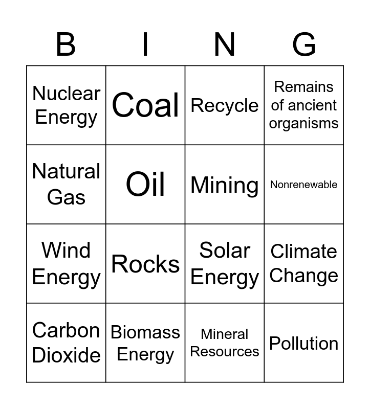 This bingo card has 24 words: Free!, Renewable, Nonrenewable, Fossil Fuels, Natural Gas, Nuclear Energy, Oil, Coal, Biomass Energy, Hydroelectric Energy, Wind Energy, Solar Energy, Geothermal Energy, Natural Resources, Mining, Reserves, Mineral Resources, Recycle, Rocks, Climate Change, Carbon Dioxide, Pollution, Remains of ancient organisms and Ores.