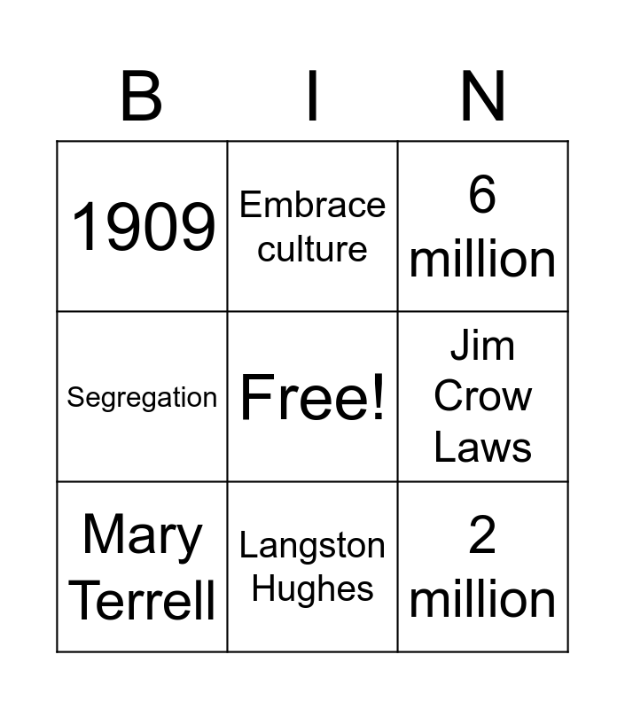 This bingo card has a free space and 8 words: Jim Crow Laws, 6 million, Embrace culture, Mary Terrell, 1909, 2 million, Segregation and Langston Hughes.