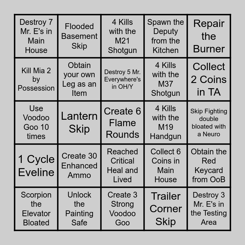 This bingo card has 51 words: Free!, Create 6 Flame Rounds, Create 6 Neuro Rounds, Create 3 Strong Voodoo Goo, Create 30 Enhanced Ammo, Collect 1 Coin in Guest House, Flooded Basement Skip, Spawn Mia with the Bathroom Skip in GH, Kill Mia 2 by Possession, Perform Main House wall skip, Obtain your own Leg as an Item, Spawn the Deputy from the Kitchen, Obtain the Red Keycard from OoB, Collect 6 Coins in Main House, Obtain the Steriod from the Drawing Room, Collect 5 Coins in Old House/Yard, Destroy 5 Mr. Everywhere's in OH/Y, 4 Kills with the M19 Handgun, Ninja walk past Marguerite, Repair the Burner, Lantern Skip, Trailer Corner Skip, Destroy 7 Mr. E's in Main House, 4 Kills with the M37 Shotgun, Unlock the Stabilizer, Destroy 3 Mr. E's in the Testing Area, Collect 2 Coins in TA, Obtain the Steriod in the TA, Scorpion the Elevator Bloated, 4 Kills with the M21 Shotgun, Destroy 2 Mr. E's on the Wrecked Ship, Collect 3 coins in WS, Skip Alan's First Call, Skip the end of Alan's Call, Unlock the Captian's Locker, Unlock the Painting Safe, 4 Kills with the MPM Handgun, Defeat Mia 3, Destroy 3 Mr. E's in the Salt Mine/GH End, Obtain the Steroid in the Salt Mines, Skip Fighting double bloated with a Neuro, 1 Cycle Eveline, Use all 4 Steroids, Use all 2 Stabilizers, 4 Kills with the Magnum, 4 Kills with a Knife, Use Voodoo Goo 10 times, Use 6 raw herbs, Use 4 Lockpicks, Reached Critical Heal and Lived and 4 Kills with Remote Bomb.