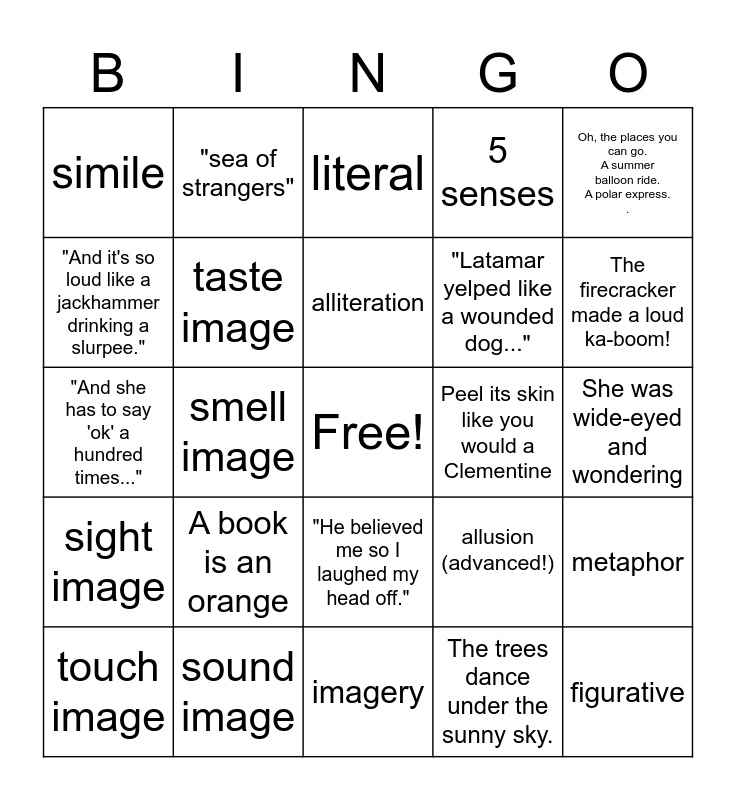 This bingo card has a free space and 24 words: A book is an orange, sound image, alliteration, touch image, Oh, the places you can go. A summer balloon ride. A polar express. ., simile, "And it's so loud like a jackhammer drinking a slurpee.", "sea of strangers", Peel its skin like you would a Clementine, "He believed me so I laughed my head off.", "Latamar yelped like a wounded dog...", "And she has to say 'ok' a hundred times...", allusion (advanced!), metaphor, taste image, The trees dance under the sunny sky., She was wide-eyed and wondering, literal, The firecracker made a loud ka-boom!, smell image, figurative, sight image, 5 senses and imagery.