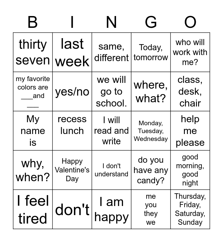 This bingo card has 25 words: Happy Valentine's Day, I am happy, we will go to school., I feel tired, who will work with me?, thirty seven, my favorite colors are ___and ___, last week, Monday, Tuesday, Wednesday, I don't understand, where, what?, My name is, do you have any candy?, good morning, good night, yes/no, Thursday, Friday, Saturday, Sunday, help me please, same, different, class, desk, chair, recess lunch, I will read and write, don't, why, when?, Today, tomorrow and me you they we.