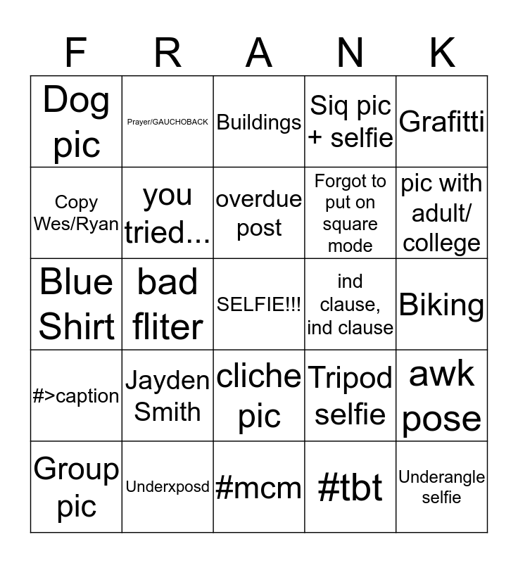 This bingo card has a free space and 24 words: Jayden Smith, Underxposd, overdue post, Group pic, Grafitti, Dog pic, Copy Wes/Ryan, Prayer/GAUCHOBACK, ind clause, ind clause, cliche pic, Forgot to put on square mode, Blue Shirt, Tripod selfie, awk pose, you tried..., #tbt, Biking, Buildings, pic with adult/ college, bad fliter, Underangle selfie, #>caption, Siq pic + selfie and #mcm.