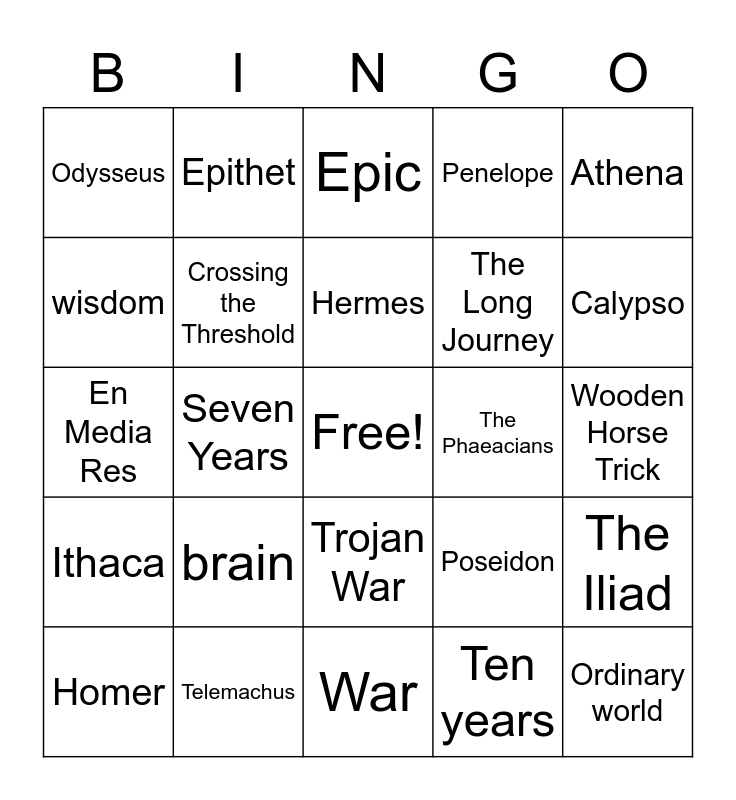 This bingo card has a free space and 24 words: brain, Telemachus, Hermes, Homer, Athena, Odysseus, wisdom, Epithet, The Phaeacians, Trojan War, The Long Journey, En Media Res, Poseidon, The Iliad, Crossing the Threshold, Ten years, Wooden Horse Trick, Epic, Calypso, Seven Years, Ordinary world, Ithaca, Penelope and War.