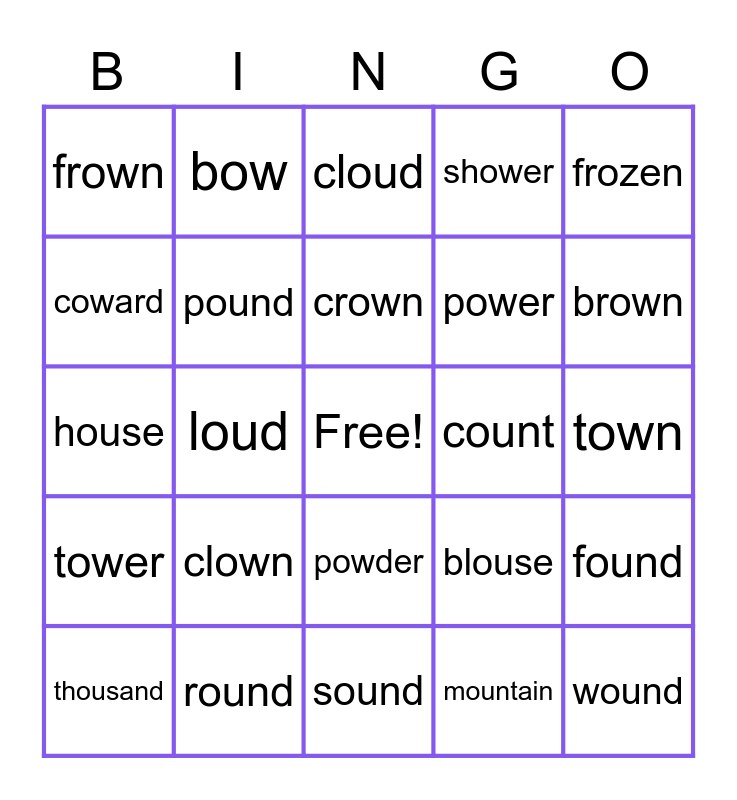 This bingo card has a free space and 24 words: clown, round, crown, thousand, frozen, frown, coward, bow, count, powder, power, house, blouse, found, pound, mountain, town, cloud, brown, loud, wound, tower, shower and sound.