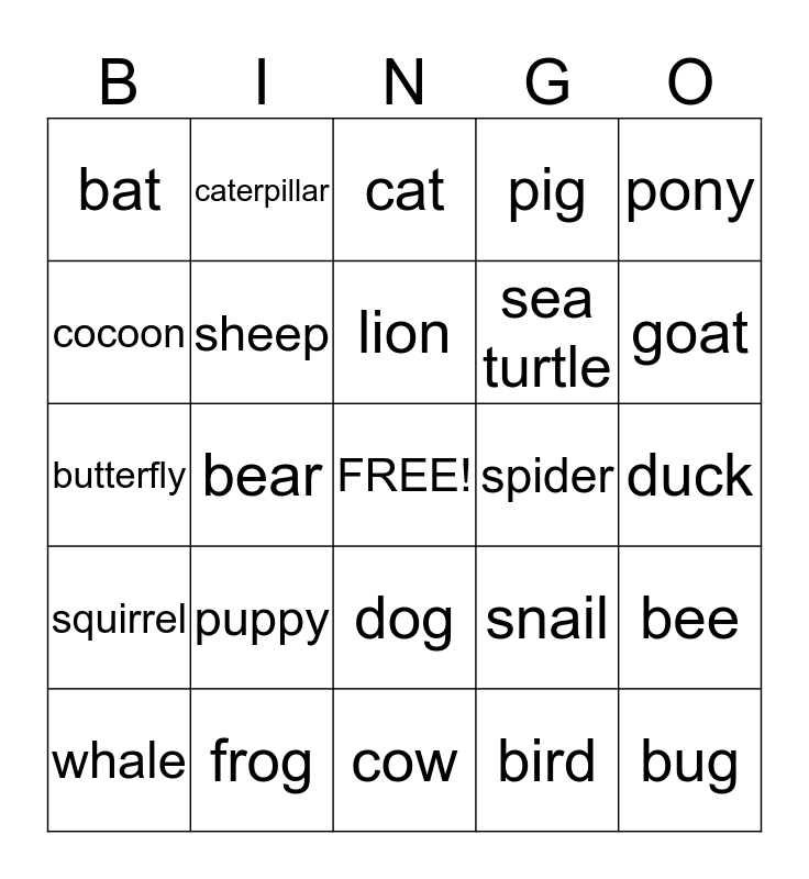 This bingo card has a free space and 30 words: frog, horse, bear, fox, bat, cat, sheep, dog, spider, cow, duck, bug, bird, worm, goat, rabbit, snail, squirrel, puppy, pony, butterfly, gorilla, caterpillar, sea turtle, cocoon, pig, bee, whale, lion and camel.