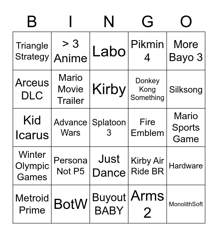 This bingo card has a free space and 24 words: Persona Not P5, BotW, Kirby, Metroid Prime, More Bayo 3, Triangle Strategy, Arceus DLC, > 3 Anime, Fire Emblem, Just Dance, Donkey Kong Something, Kid Icarus, Kirby Air Ride BR, Hardware, Mario Movie Trailer, Arms 2, Mario Sports Game, Labo, Silksong, Advance Wars, MonolithSoft, Winter Olympic Games, Pikmin 4 and Buyout BABY.