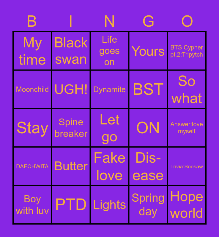 This bingo card has a free space and 24 words: Butter, PTD, Dynamite, Boy with luv, BTS Cypher pt.2:Tripytch, My time, Moonchild, Black swan, ON, Fake love, BST, Stay, Dis-ease, Trivia:Seesaw, UGH!, Spring day, Answer:love myself, Life goes on, So what, Spine breaker, Hope world, DAECHWITA, Yours and Lights.