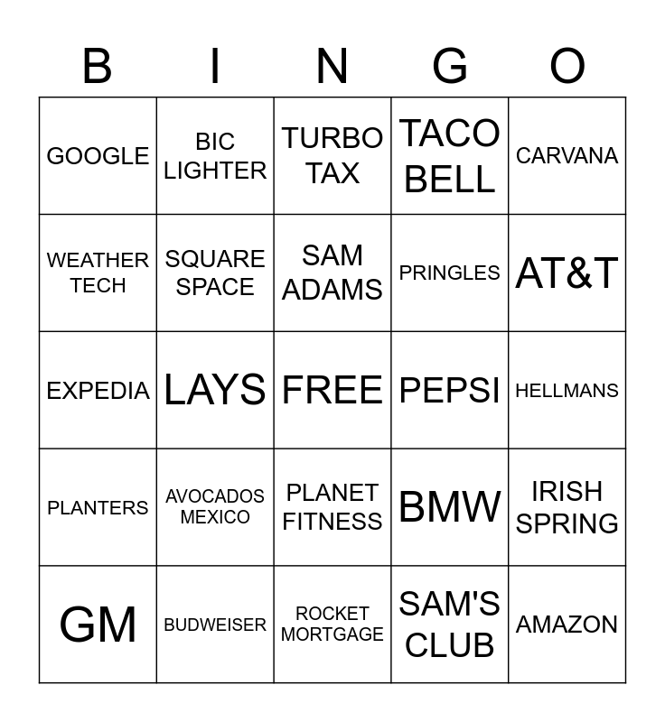 This bingo card has a free space and 30 words: BUDWEISER, UBER EATS, LAYS, BUSCH, GOOGLE, TURBO TAX, SQUARE SPACE, PLANET FITNESS, PEPSI, ROCKET MORTGAGE, HELLMANS, AMAZON, SAM'S CLUB, NISSAN, AT&T, BOOKING .COM, BMW, PLANTERS, AVOCADOS MEXICO, CARVANA, EXPEDIA, KIA, BIC LIGHTER, PRINGLES, WEATHER TECH, TACO BELL, IRISH SPRING, GM, SAM ADAMS and DORITOS.