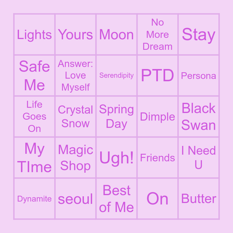 This bingo card has a free space and 24 words: Magic Shop, seoul, Serendipity, Dynamite, Stay, Lights, Safe Me, Yours, Dimple, Ugh!, PTD, Life Goes On, Friends, I Need U, Answer: Love Myself, On, Black Swan, Moon, Persona, Crystal Snow, Butter, My TIme, No More Dream and Best of Me.