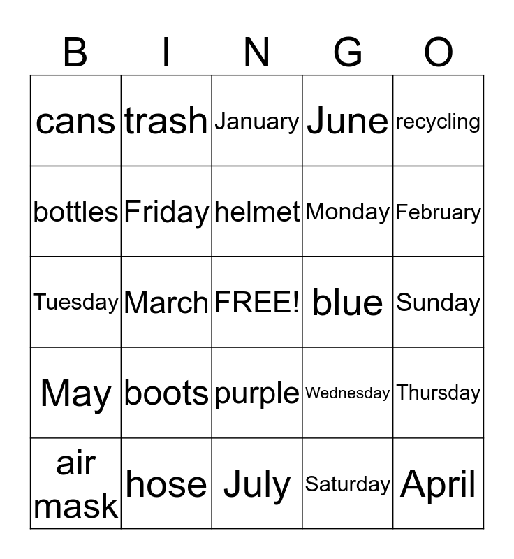 This bingo card has a free space and 24 words: boots, hose, helmet, air mask, recycling, cans, bottles, trash, blue, purple, Monday, Tuesday, Wednesday, Thursday, Friday, Saturday, Sunday, January, February, March, April, May, June and July.