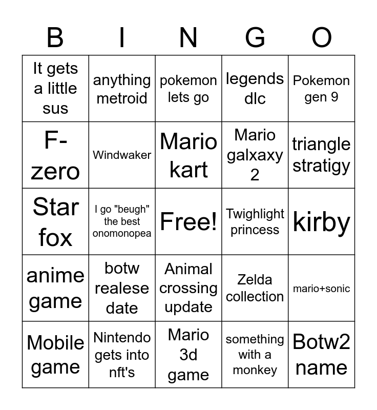 This bingo card has a free space and 29 words: Mobile game, Botw2 trailer, I go "beugh" the best onomonopea, new 99 game, It gets a little sus, pokemon lets go, Windwaker, botw realese date, Twighlight princess, Nintendo gets into nft's, kirby, Botw2 name, Mario 3d game, something with a monkey, triangle stratigy, Botw2 realese date, Animal crossing update, anime game, Pokemon gen 9, Star fox, Zelda collection, Lego, Mario galxaxy 2, F-zero, legends dlc, anything metroid, mario+sonic, Mario kart and Mario party dlc.