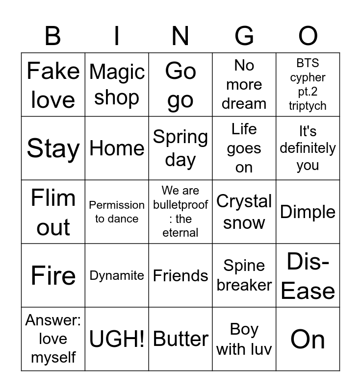 This bingo card has a free space and 24 words: Dynamite, UGH!, Spring day, Answer: love myself, BTS cypher pt.2 triptych, Fake love, Stay, Magic shop, Crystal snow, Friends, Life goes on, Flim out, Spine breaker, Dis-Ease, Home, Boy with luv, Dimple, Go go, It's definitely you, Permission to dance, On, Fire, No more dream and Butter.