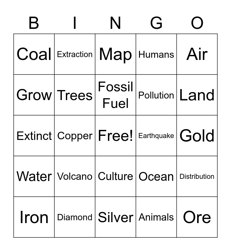 This bingo card has a free space and 29 words: Iron, Oil, Copper, Natural Gas, Coal, Map, Trees, Volcano, Earthquake, Diamond, Gold, Ore, Silver, Animals, Land, Economy, Culture, Water, Air, Extinct, Ocean, Dust, Pollution, Grow, Humans, Extraction, Distribution, Fossil Fuel and Mineral.