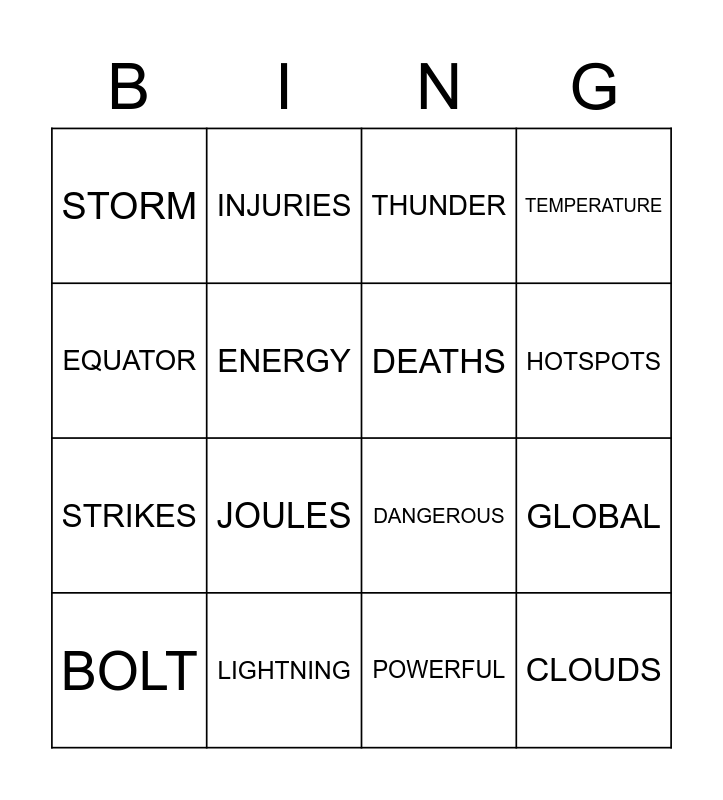 This bingo card has 16 words: LIGHTNING, GLOBAL, THUNDER, STORM, STRIKES, INJURIES, DANGEROUS, POWERFUL, EQUATOR, ENERGY, BOLT, TEMPERATURE, JOULES, HOTSPOTS, DEATHS and CLOUDS.