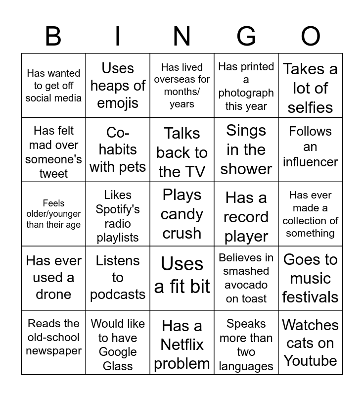 This bingo card has 25 words: Listens to podcasts, Has a Netflix problem, Talks back to the TV, Reads the old-school newspaper, Takes a lot of selfies, Has wanted to get off social media, Has felt mad over someone's tweet, Uses heaps of emojis, Has a record player, Uses a fit bit, Sings in the shower, Feels older/younger than their age, Believes in smashed avocado on toast, Goes to music festivals, Co-habits with pets, Watches cats on Youtube, Has ever made a collection of something, Has lived overseas for months/ years, Follows an influencer, Likes Spotify's radio playlists, Plays candy crush, Would like to have Google Glass, Has ever used a drone, Has printed a photograph this year and Speaks more than two languages.