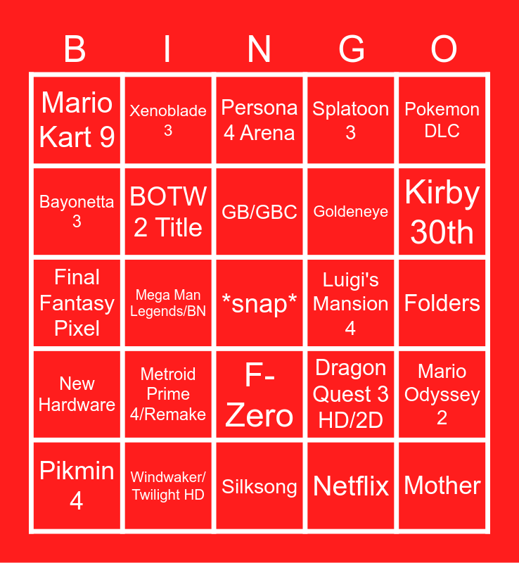 This bingo card has a free space and 24 words: Metroid Prime 4/Remake, Windwaker/ Twilight HD, GB/GBC, Pikmin 4, Pokemon DLC, Mario Kart 9, Bayonetta 3, Xenoblade 3, Luigi's Mansion 4, F-Zero, Goldeneye, Final Fantasy Pixel, Dragon Quest 3 HD/2D, Mario Odyssey 2, BOTW 2 Title, Netflix, Folders, Persona 4 Arena, Kirby 30th, Mega Man Legends/BN, Mother, New Hardware, Splatoon 3 and Silksong.