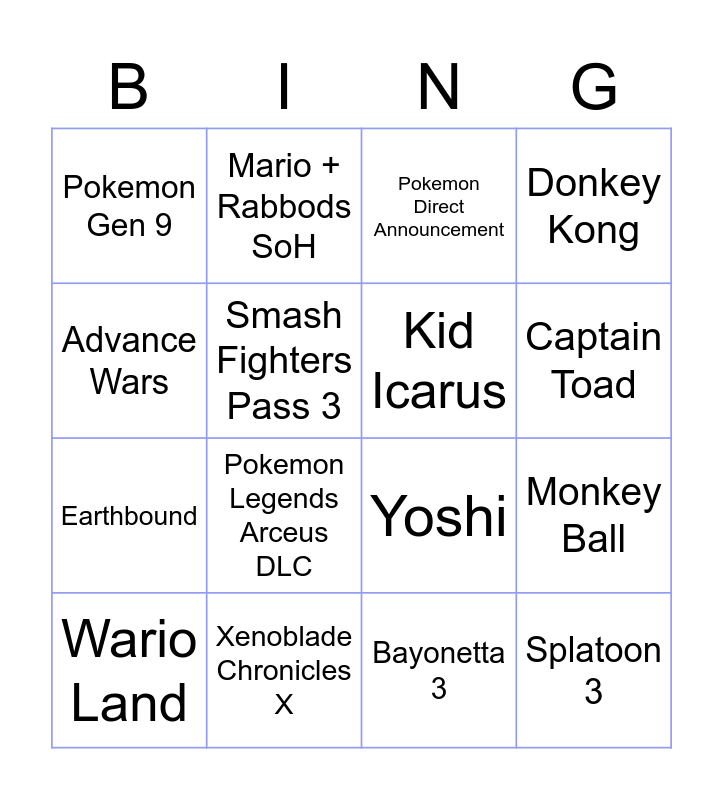 This bingo card has 16 words: Xenoblade Chronicles X, Monkey Ball, Pokemon Direct Announcement, Pokemon Gen 9, Earthbound, Mario + Rabbods SoH, Yoshi, Bayonetta 3, Advance Wars, Smash Fighters Pass 3, Wario Land, Donkey Kong, Pokemon Legends Arceus DLC, Captain Toad, Kid Icarus and Splatoon 3.