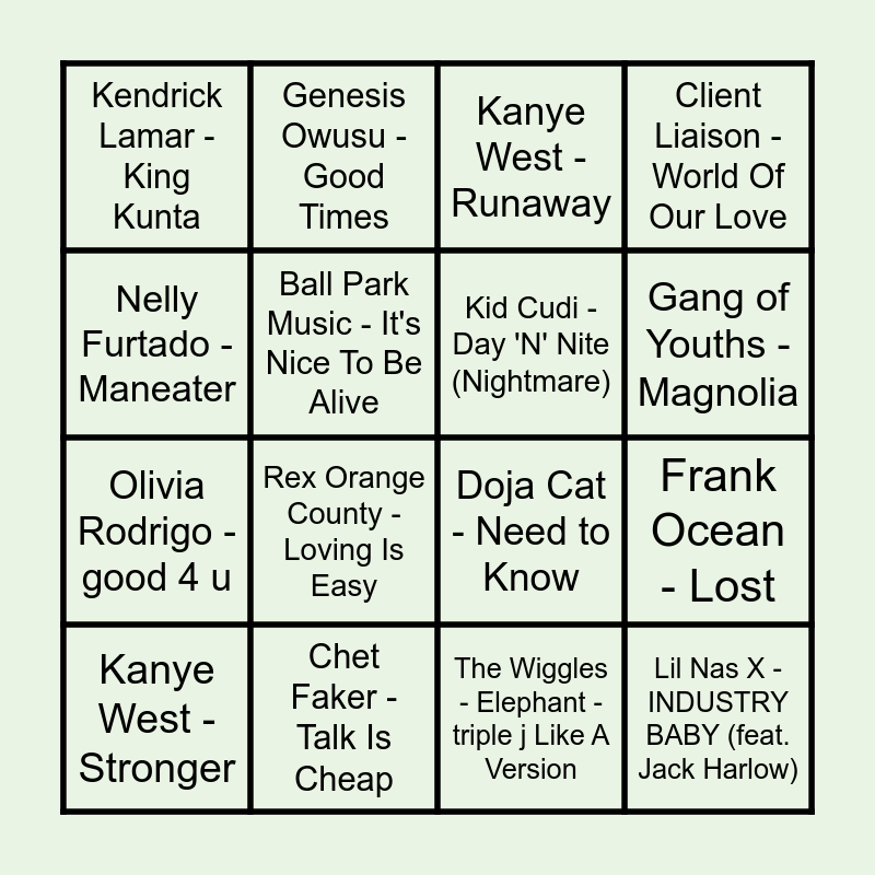 This bingo card has 61 words: Rockwell - Somebody's Watching Me, Glass Animals - Heat Waves, The Kid LAROI - STAY (with Justin Bieber), Lil Nas X - INDUSTRY BABY (feat. Jack Harlow), Grover Washington, Jr. - Just the Two of Us (feat. Bill Withers), Doja Cat - Kiss Me More (feat. SZA), Kid Cudi - Day 'N' Nite (Nightmare), Lil Nas X - MONTERO (Call Me By Your Name), Olivia Rodrigo - good 4 u, Black Eyed Peas - Meet Me Halfway, Client Liaison - World Of Our Love, Vampire Weekend - A-Punk, Ball Park Music - It's Nice To Be Alive, Madonna - Holiday, Post Malone - Congratulations, Kendrick Lamar - King Kunta, Kanye West - Stronger, Nelly Furtado - Maneater, Touch Sensitive - Lay Down, Gang of Youths - Magnolia, Chet Faker - Talk Is Cheap, Kanye West - Runaway, M83 - Midnight City, Childish Gambino - Redbone, Disclosure - Latch, Kendrick Lamar - HUMBLE., Arctic Monkeys - Why'd You Only Call Me When You're High?, J. Cole - No Role Modelz, Rex Orange County - Loving Is Easy, THE ANXIETY - Meet Me At Our Spot, The Weeknd - Blinding Lights, Riton - Friday (feat. Mufasa & Hypeman) - Dopamine Re-Edit, Justin Bieber - Peaches (feat. Daniel Caesar & Giveon), Far East Movement - Like A G6, Genesis Owusu - Good Times, Elton John - Cold Heart - PNAU Remix, ACRAZE - Do It To It, Frank Ocean - Lost, Yothu Yindi - Treaty, Doja Cat - Need to Know, bbno$ - edamame (feat. Rich Brian), Luude - Down Under (feat. Colin Hay), The Wiggles - Elephant - triple j Like A Version, Mac Miller - The Spins, Michael Jackson - Love Never Felt So Good, Savage Garden - Truly Madly Deeply, Rod Stewart - Da Ya Think I'm Sexy?, Oliver Tree - Life Goes On, A-Wall - Loverboy, Disclosure - You & Me - Flume Remix, Majestic - Rasputin, Mura Masa - Love$ick, The Wombats - Greek Tragedy - Oliver Nelson TikTok Remix, Duck Sauce - aNYway, Spacey Jane - Booster Seat, Faith No More - Easy, Stardust - Music Sounds Better With You, Daryl Hall & John Oates - You Make My Dreams (Come True), ABBA - Dancing Queen, Vance Joy - Riptide and Eiffel 65 - Blue (Flume Remix).