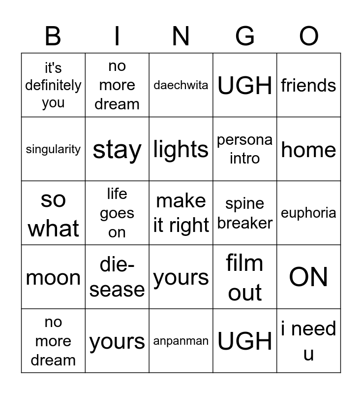 This bingo card has a free space and 29 words: seoul, yours, daechwita, hope world, friends, it's definitely you, stay, lights, spine breaker, ON, no more dream, life goes on, UGH, i need u, so what, permission to dance, anpanman, film out, home, moon, die-sease, Butter, persona intro, euphoria, singularity, no more dream, yours, UGH and stay.