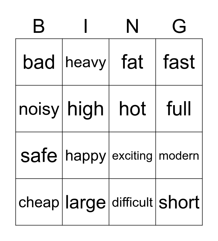This bingo card has 16 words: large, modern, fat, bad, safe, heavy, exciting, difficult, noisy, high, cheap, fast, happy, full, hot and short.