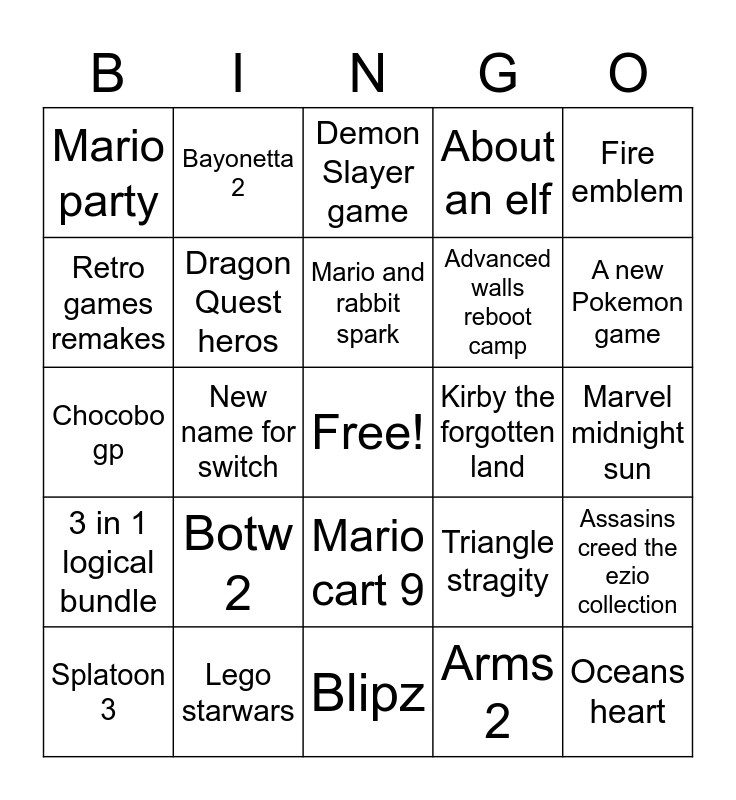 This bingo card has a free space and 24 words: Botw 2, Lego starwars, Mario and rabbit spark, Splatoon 3, Fire emblem, Mario party, Retro games remakes, Bayonetta 2, Kirby the forgotten land, Mario cart 9, Advanced walls reboot camp, Chocobo gp, Triangle stragity, Assasins creed the ezio collection, Dragon Quest heros, Arms 2, Marvel midnight sun, Demon Slayer game, A new Pokemon game, New name for switch, Oceans heart, 3 in 1 logical bundle, About an elf and Blipz.