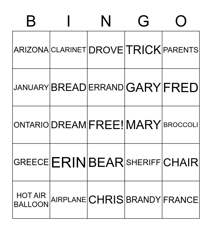 This bingo card has a free space and 24 words: ERIN, AIRPLANE, ERRAND, HOT AIR BALLOON, PARENTS, ARIZONA, JANUARY, CLARINET, MARY, BEAR, GARY, ONTARIO, SHERIFF, CHAIR, BREAD, BRANDY, BROCCOLI, DROVE, FRED, DREAM, FRANCE, GREECE, TRICK and CHRIS.