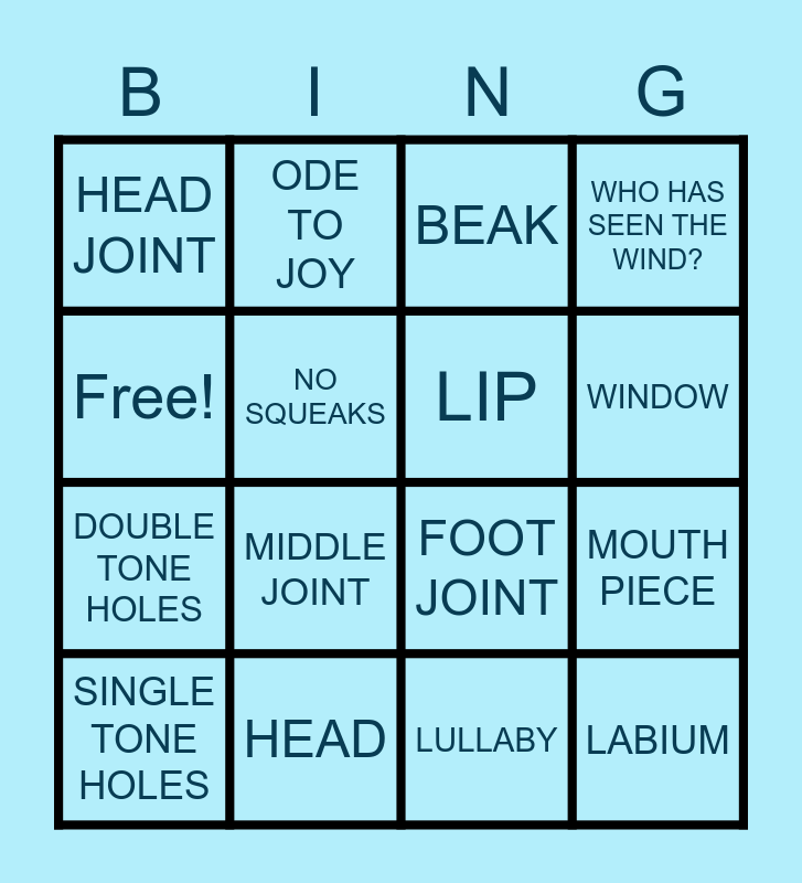 This bingo card has 16 words: HEAD, MOUTH PIECE, BEAK, HEAD JOINT, DOUBLE TONE HOLES, ODE TO JOY, FOOT JOINT, LULLABY, Free!, NO SQUEAKS, SINGLE TONE HOLES, WHO HAS SEEN THE WIND?, MIDDLE JOINT, WINDOW, LIP and LABIUM.