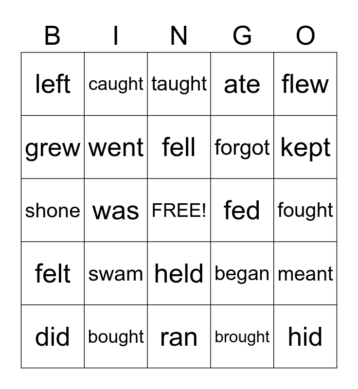 This bingo card has a free space and 24 words: swam, bought, fell, did, flew, left, grew, caught, fed, held, forgot, shone, began, meant, went, brought, fought, taught, kept, was, hid, felt, ate and ran.