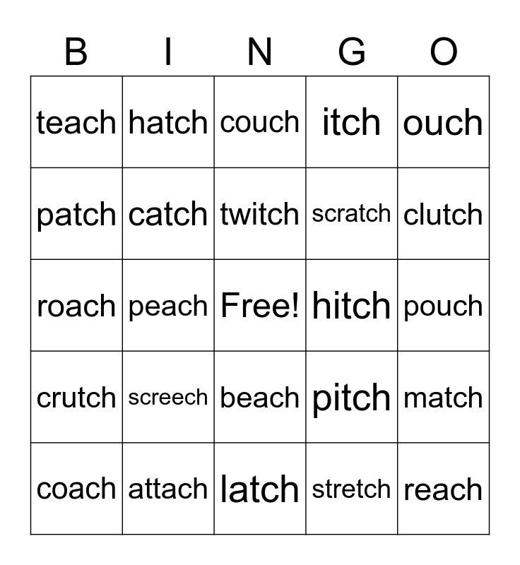 This bingo card has a free space and 24 words: screech, attach, twitch, coach, ouch, teach, patch, hatch, hitch, beach, scratch, roach, pitch, match, catch, stretch, pouch, couch, clutch, peach, reach, crutch, itch and latch.