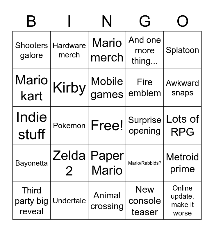 This bingo card has a free space and 24 words: Zelda 2, Undertale, Mobile games, Third party big reveal, Splatoon, Shooters galore, Mario kart, Hardware merch, Surprise opening, Paper Mario, Fire emblem, Indie stuff, Mario/Rabbids?, Metroid prime, Kirby, New console teaser, Lots of RPG, Mario merch, Awkward snaps, Pokemon, Online update, make it worse, Bayonetta, And one more thing... and Animal crossing.