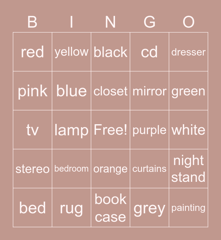 This bingo card has a free space and 24 words: bedroom, rug, closet, bed, dresser, red, pink, yellow, purple, orange, mirror, tv, curtains, night stand, blue, grey, white, black, green, lamp, painting, stereo, cd and book case.
