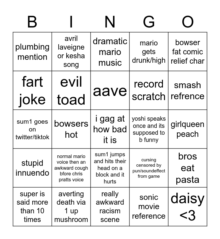 This bingo card has a free space and 24 words: normal mario voice then an awkward cough bfore chris pratts voice, averting death via 1 up mushroom, aave, super is said more than 10 times, bowser fat comic relief char, plumbing mention, fart joke, avril laveigne or kesha song, yoshi speaks once and its supposed to b funny, sum1 jumps and hits their head on a block and it hurts, record scratch, sum1 goes on twitter/tiktok, cursing censored by pun/soundeffect from game, bros eat pasta, evil toad, sonic movie reference, girlqueen peach, dramatic mario music, smash refrence, bowsers hot, daisy <3, stupid innuendo, mario gets drunk/high and really awkward racism scene.