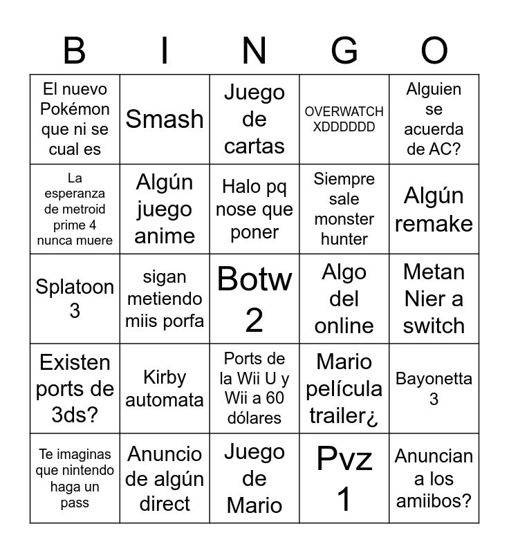 This bingo card has a free space and 24 words: Kirby automata, Anuncio de algún direct, Halo pq nose que poner, Te imaginas que nintendo haga un pass, Alguien se acuerda de AC?, El nuevo Pokémon que ni se cual es, La esperanza de metroid prime 4 nunca muere, Smash, Algo del online, Ports de la Wii U y Wii a 60 dólares, Siempre sale monster hunter, Splatoon 3, Mario película trailer¿, Bayonetta 3, Algún juego anime, Pvz 1, Metan Nier a switch, Juego de cartas, Algún remake, sigan metiendo miis porfa, Anuncian a los amiibos?, Existen ports de 3ds?, OVERWATCH XDDDDDD and Juego de Mario.