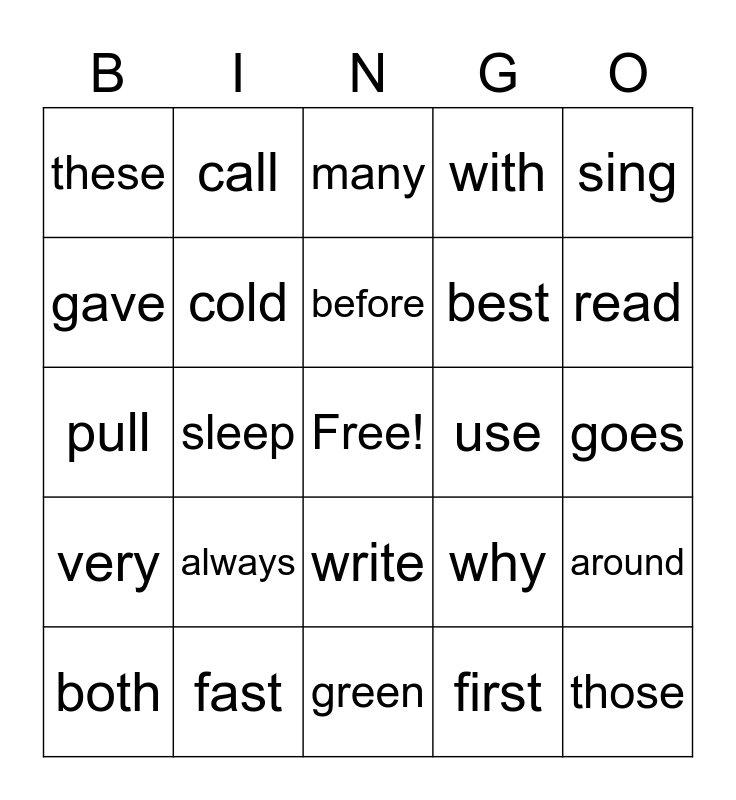 This bingo card has a free space and 24 words: always, fast, before, both, sing, these, gave, call, use, write, best, pull, why, around, cold, first, goes, many, read, sleep, those, very, with and green.