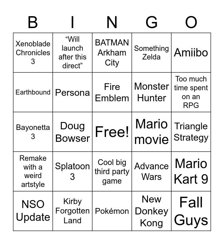 This bingo card has a free space and 24 words: Splatoon 3, Kirby Forgotten Land, Fire Emblem, NSO Update, Amiibo, Xenoblade Chronicles 3, Earthbound, “Will launch after this direct”, Mario movie, Cool big third party game, Monster Hunter, Bayonetta 3, Advance Wars, Mario Kart 9, Persona, New Donkey Kong, Triangle Strategy, BATMAN Arkham City, Too much time spent on an RPG, Doug Bowser, Fall Guys, Remake with a weird artstyle, Something Zelda and Pokémon.