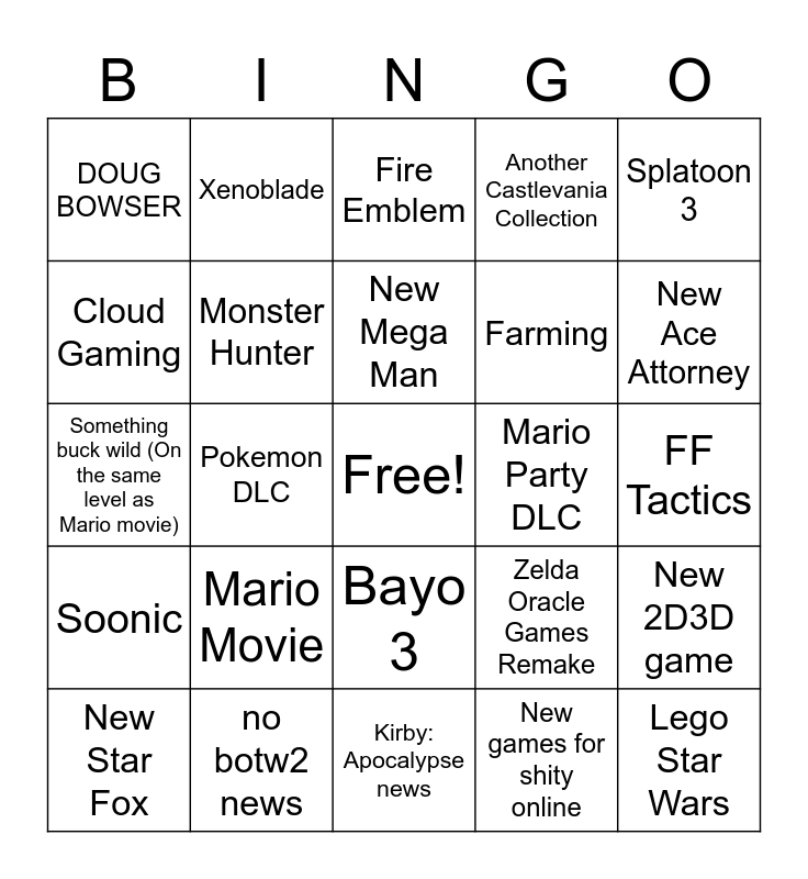 This bingo card has a free space and 24 words: Mario Movie, no botw2 news, New Mega Man, New Star Fox, Splatoon 3, DOUG BOWSER, Cloud Gaming, Xenoblade, Mario Party DLC, Bayo 3, Farming, Something buck wild (On the same level as Mario movie), Zelda Oracle Games Remake, New 2D3D game, Monster Hunter, New games for shity online, FF Tactics, Fire Emblem, New Ace Attorney, Pokemon DLC, Lego Star Wars, Soonic, Another Castlevania Collection and Kirby: Apocalypse news.