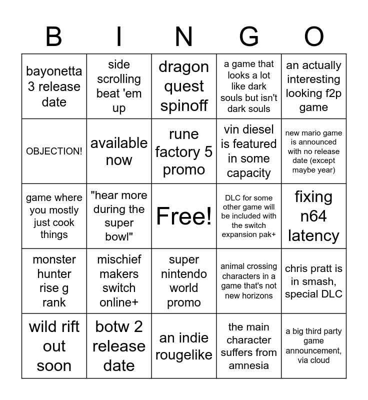 This bingo card has a free space and 24 words: mischief makers switch online+, botw 2 release date, rune factory 5 promo, wild rift out soon, an actually interesting looking f2p game, bayonetta 3 release date, OBJECTION!, side scrolling beat 'em up, DLC for some other game will be included with the switch expansion pak+, super nintendo world promo, vin diesel is featured in some capacity, game where you mostly just cook things, animal crossing characters in a game that's not new horizons, chris pratt is in smash, special DLC, available now, the main character suffers from amnesia, fixing n64 latency, dragon quest spinoff, new mario game is announced with no release date (except maybe year), "hear more during the super bowl", a big third party game announcement, via cloud, monster hunter rise g rank, a game that looks a lot like dark souls but isn't dark souls and an indie rougelike.