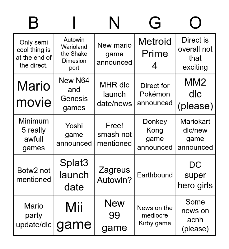 This bingo card has a free space and 24 words: Splat3 launch date, Mii game, MHR dlc launch date/news, Mario party update/dlc, Direct is overall not that exciting, Only semi cool thing is at the end of the direct., Mario movie, Autowin Warioland the Shake Dimesion port, Donkey Kong game announced, Zagreus Autowin?, Direct for Pokémon announced, Minimum 5 really awfull games, Earthbound, DC super hero girls, New N64 and Genesis games, News on the mediocre Kirby game, Mariokart dlc/new game announced, New mario game announced, MM2 dlc (please), Yoshi game announced, Some news on acnh (please), Botw2 not mentioned, Metroid Prime 4 and New 99 game.