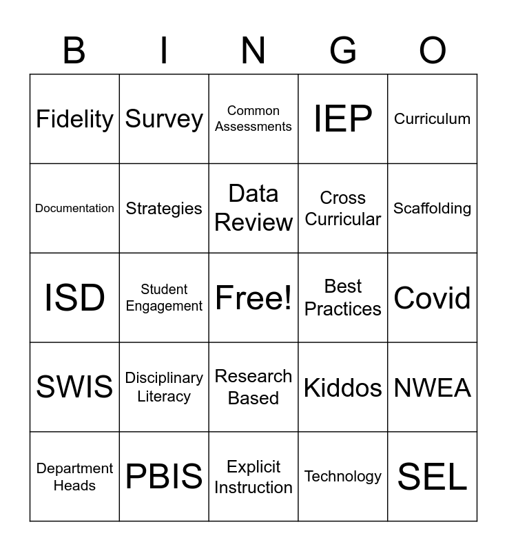 This bingo card has a free space and 24 words: Disciplinary Literacy, PBIS, Data Review, Department Heads, Curriculum, Fidelity, Documentation, Survey, Best Practices, Research Based, Cross Curricular, ISD, Kiddos, NWEA, Strategies, Technology, Covid, Common Assessments, Scaffolding, Student Engagement, SEL, SWIS, IEP and Explicit Instruction.
