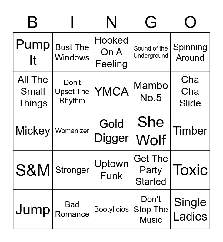This bingo card has a free space and 79 words: We Like to Party!, 9 to 5, Hooked On A Feeling, Come on Eileen, Dancing Queen, Valerie, Filthy/Gorgeous, Maniac 2000, Take Me Out, Hey Ya!, Milkshake, Hollaback Girl, Sound of the Underground, Spinning Around, Mama Do The Hump, Don't Upset The Rhythm, American Boy, She Wolf, SOS, Mickey, Bonkers, YMCA, Mambo No.5, Cha Cha Slide, Pump It, Yeah!, Crazy In Love, It Wasn't Me, Hollaback Girl, Wannabe, Stronger, Poker Face, Don't Stop The Music, Timber, The Real Slim Shady, Bad Romance, Rock Your body, Ms.Jackson, Toxic, All The Small Things, Promiscuous, Pon de Replay, Dancing Queen, I Wanna Dance With Somebody, Just Dance, Bust The Windows, Uptown Funk, Umbrella, I Kissed A Girl, Drop It Like its hot, Hips Dont Lie, Bootylicios, Get The Party Started, Don't Cha, Boom Boom Pow, Low, Evacuate The Dancefloor, Don't Stop Moving, 4 Minutes, Jump, Womanizer, Sexy Back, I Gotta Feeling, When I Grow Up, Candyman, Push The Button, Since U Been Gone, Telephone, Party Rock Anthem, S&M, Spice Up Your Life, Raise Your Glass, Everytime We Touch, Single Ladies, Party in the U.S.A, From Paris to Berlin, Can't Get You out of My Head, Call Me Maybe and Only Girl (In The World).