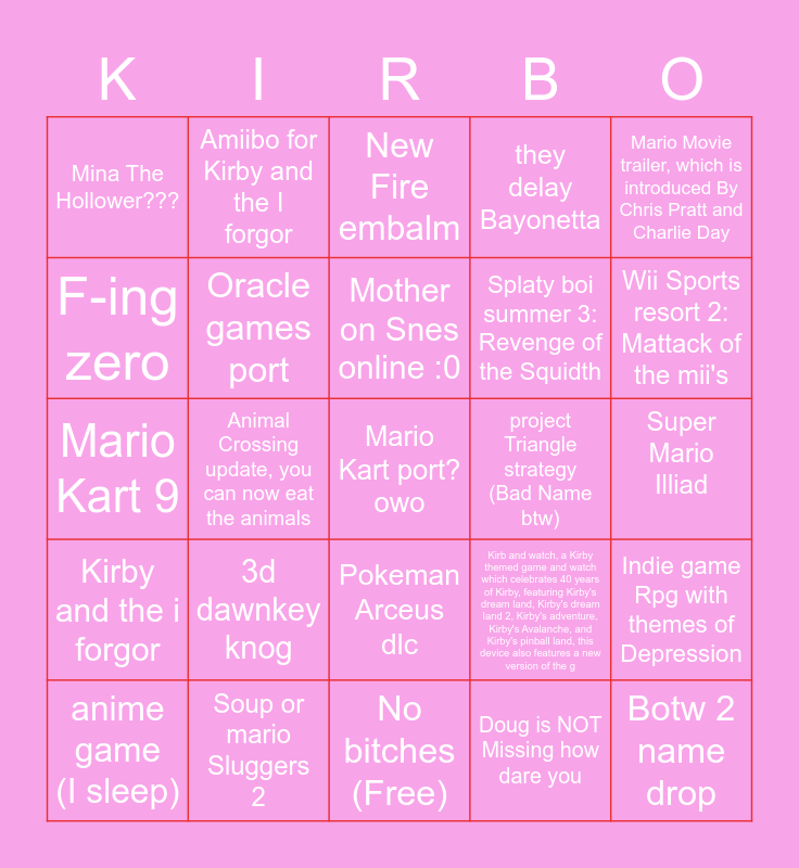 This bingo card has 25 words: Kirby and the i forgor, Soup or mario Sluggers 2, Mario Kart port? owo, Doug is NOT Missing how dare you, Mario Movie trailer, which is introduced By Chris Pratt and Charlie Day, Mina The Hollower???, Amiibo for Kirby and the I forgor, New Fire embalm, project Triangle strategy (Bad Name btw), Indie game Rpg with themes of Depression, F-ing zero, Oracle games port, No bitches (Free), Kirb and watch, a Kirby themed game and watch which celebrates 40 years of Kirby, featuring Kirby's dream land, Kirby's dream land 2, Kirby's adventure, Kirby's Avalanche, and Kirby's pinball land, this device also features a new version of the g, Wii Sports resort 2: Mattack of the mii's, anime game (I sleep), Animal Crossing update, you can now eat the animals, Mother on Snes online :0, Splaty boi summer 3: Revenge of the Squidth, Super Mario Illiad, Mario Kart 9, 3d dawnkey knog, Pokeman Arceus dlc, they delay Bayonetta and Botw 2 name drop.