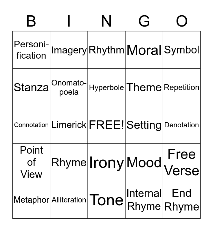 This bingo card has a free space and 24 words: Rhyme, Alliteration, Hyperbole, Metaphor, Symbol, Personi- fication, Stanza, Imagery, Setting, Irony, Theme, Connotation, Mood, Free Verse, Onomato-poeia, Internal Rhyme, Denotation, Rhythm, Repetition, Limerick, End Rhyme, Point of View, Moral and Tone.