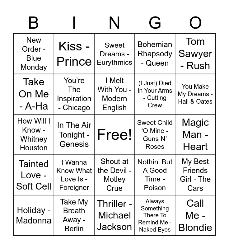This bingo card has a free space and 37 words: Your Love - The Outfielders, We Built This City - Starship, Roxanne - The Police, You’re The Inspiration - Chicago, My Best Friends Girl - The Cars, I Wanna Know What Love Is - Foreigner, I Melt With You - Modern English, Burning Down the House - Talking Heads, Tom Sawyer - Rush, Livin’ On A Prayer - Bon Jovi, In The Air Tonight - Genesis, Bohemian Rhapsody - Queen, Call Me - Blondie, Magic Man - Heart, Take On Me - A-Ha, Tainted Love - Soft Cell, Our Lips Are Sealed - The Go-go’s, Sweet Dreams - Eurythmics, Shout at the Devil - Motley Crue, Sweet Child ‘O Mine - Guns N’ Roses, New Order - Blue Monday, You Make My Dreams - Hall & Oates, Holiday - Madonna, Thriller - Michael Jackson, Edge of Seventeen - Stevie Nicks, Always Something There To Remind Me - Naked Eyes, Kiss - Prince, Total Eclipse of the Heart - Bonnie Tyler, Don’t You Want Me - The Human League, It’s Raining Men - The Weather Girls, White Wedding - Billy Idol, Take My Breath Away - Berlin, How Will I Know - Whitney Houston, Straight Up - Paula Abdul, Nothin’ But A Good Time - Poison, (I Just) Died In Your Arms - Cutting Crew and Bust A Move - Stone Cold Rhymin’.