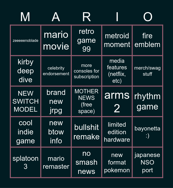 This bingo card has a free space and 24 words: new btow info, mario remaster, more consoles for subscription, splatoon 3, fire emblem, zeeeeenoblade, kirby deep dive, mario movie, arms 2, bullshit remake, media features (netflix, etc), NEW SWITCH MODEL, limited edition hardware, bayonetta :), celebrity endorsement, new format pokemon, rhythm game, retro game 99, merch/swag stuff, brand new jrpg, japanese NSO port, cool indie game, metroid moment and no smash news.