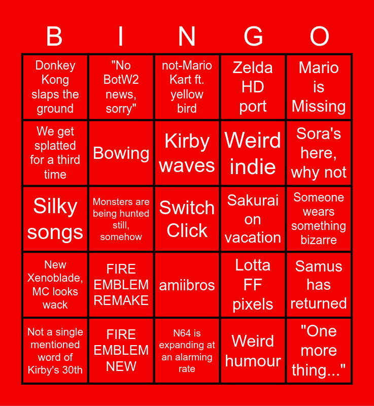 This bingo card has a free space and 24 words: FIRE EMBLEM REMAKE, FIRE EMBLEM NEW, Kirby waves, Not a single mentioned word of Kirby's 30th, Mario is Missing, Donkey Kong slaps the ground, We get splatted for a third time, "No BotW2 news, sorry", Sakurai on vacation, amiibros, Weird indie, Silky songs, Lotta FF pixels, Samus has returned, Bowing, Weird humour, Someone wears something bizarre, not-Mario Kart ft. yellow bird, Sora's here, why not, Monsters are being hunted still, somehow, "One more thing...", New Xenoblade, MC looks wack, Zelda HD port and N64 is expanding at an alarming rate.