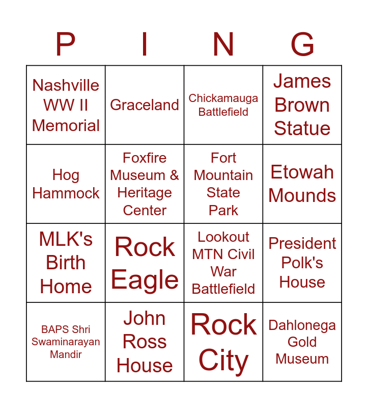 This bingo card has 16 words: John Ross House, President Polk's House, Chickamauga Battlefield, Nashville WW II Memorial, MLK's Birth Home, Graceland, Lookout MTN Civil War Battlefield, Rock City, Hog Hammock, Foxfire Museum & Heritage Center, BAPS Shri Swaminarayan Mandir, James Brown Statue, Rock Eagle, Etowah Mounds, Fort Mountain State Park and Dahlonega Gold Museum.