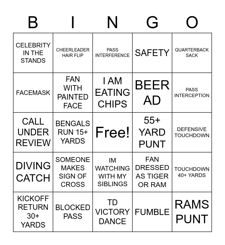 This bingo card has a free space and 28 words: TOUCHDOWN 40+ YARDS, ANY TEAM SCORES 20+ POINTS, BEER AD, FUMBLE, FACEMASK, PASS INTERFERENCE, CHEERLEADER HAIR FLIP, DIVING CATCH, 55+ YARD PUNT, KICKOFF RETURN 30+ YARDS, CALL UNDER REVIEW, SAFETY, BLOCKED PASS, TD VICTORY DANCE, PASS INTERCEPTION, PLAYER PRAYS, SOMEONE MAKES SIGN OF CROSS, FAN WITH PAINTED FACE, I AM EATING CHIPS, IM WATCHING WITH MY SIBLINGS, CELEBRITY IN THE STANDS, MOVIE COMMERCIAL, RAMS PUNT, BENGALS RUN 15+ YARDS, DEFENSIVE TOUCHDOWN, FAN DRESSED AS TIGER OR RAM, QUARTERBACK SACK and FAST FOOD COMMERCIAL.