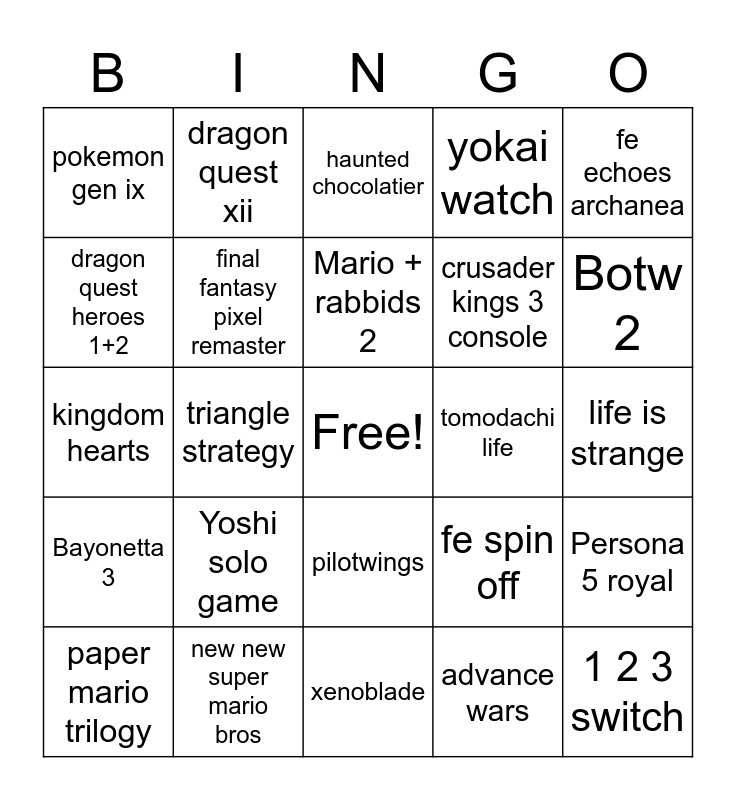 This bingo card has a free space and 24 words: Yoshi solo game, new new super mario bros, Mario + rabbids 2, paper mario trilogy, fe echoes archanea, pokemon gen ix, dragon quest heroes 1+2, dragon quest xii, tomodachi life, pilotwings, crusader kings 3 console, kingdom hearts, fe spin off, Persona 5 royal, final fantasy pixel remaster, advance wars, life is strange, haunted chocolatier, Botw 2, triangle strategy, 1 2 3 switch, Bayonetta 3, yokai watch and xenoblade.