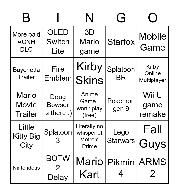 This bingo card has a free space and 24 words: Splatoon 3, BOTW 2 Delay, Kirby Skins, Nintendogs, Mobile Game, More paid ACNH DLC, Bayonetta Trailer, OLED Switch Lite, Pokemon gen 9, Literally no whisper of Metroid Prime, Splatoon BR, Mario Movie Trailer, Lego Starwars, Fall Guys, Fire Emblem, Pikmin 4, Wii U game remake, 3D Mario game, Kirby Online Multiplayer, Doug Bowser is there :), ARMS 2, Little Kitty Big City, Starfox and Mario Kart.