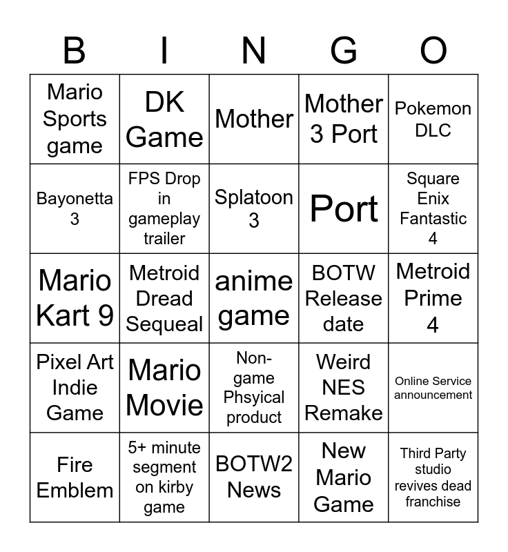 This bingo card has a free space and 24 words: Mario Movie, 5+ minute segment on kirby game, Splatoon 3, Fire Emblem, Pokemon DLC, Mario Sports game, Bayonetta 3, DK Game, BOTW Release date, Non-game Phsyical product, Port, Mario Kart 9, Weird NES Remake, Online Service announcement, FPS Drop in gameplay trailer, New Mario Game, Metroid Prime 4, Mother, Square Enix Fantastic 4, Metroid Dread Sequeal, Third Party studio revives dead franchise, Pixel Art Indie Game, Mother 3 Port and BOTW2 News.